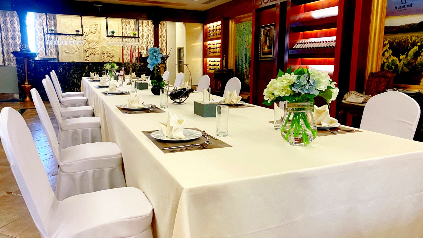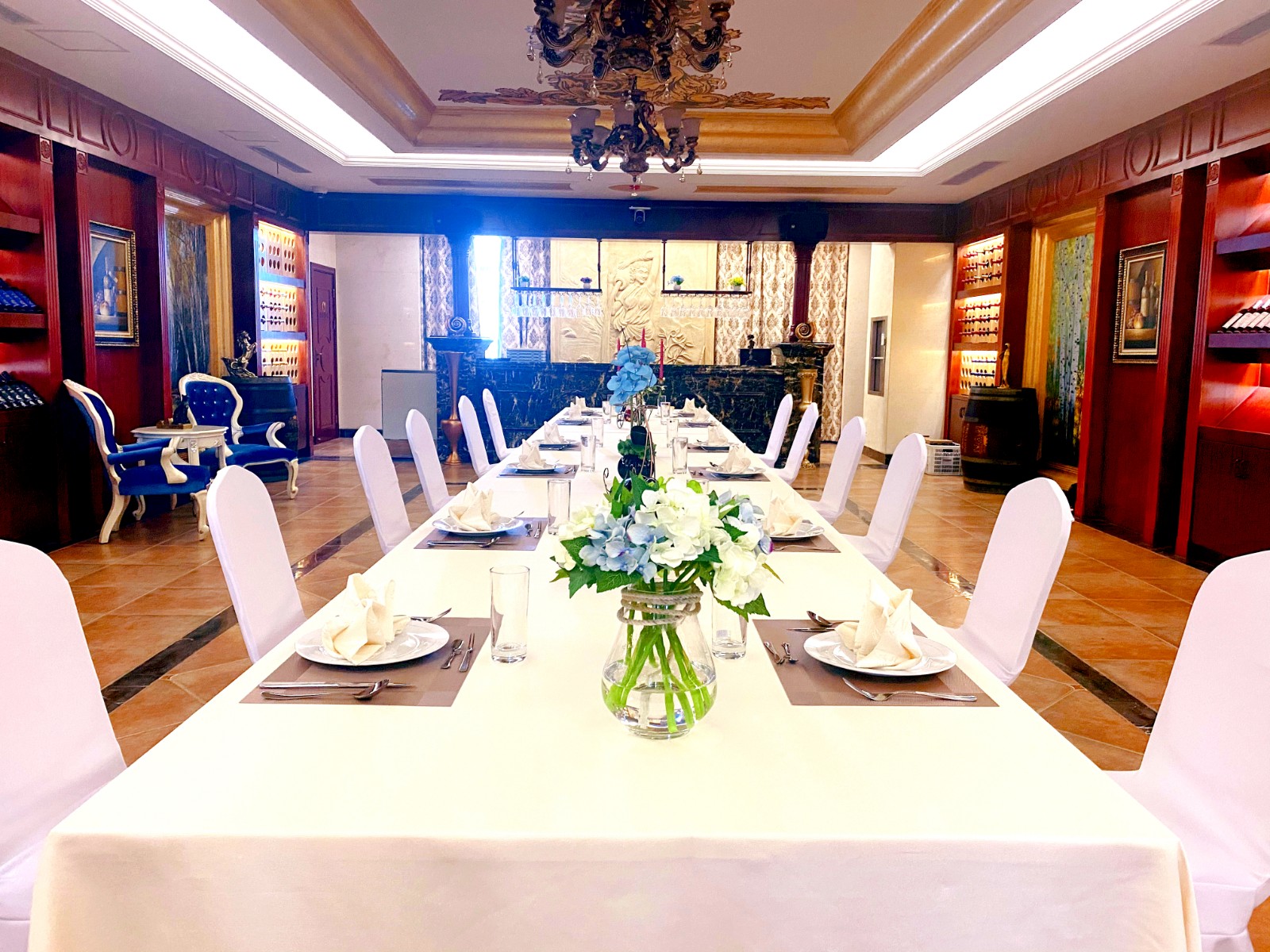 進入用餐區域,整體以沉穩大氣的棕紅色為主。從簡單到繁雜,從整體到局部,精琢細雕。中間的長桌搭配白色桌布,上面擺放著整齊的餐具和鮮花,從細節之中提升了空間的格調,一點一滴的堆砌出整個空間的韻味。